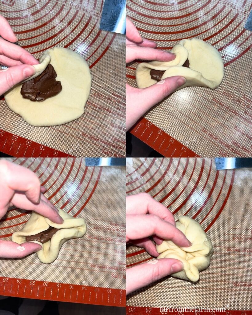 - Roll each piece to about 1/4 inch thick, add 1 tbsp Nutella to the center, then pull the edges over and pinch tightly to seal.